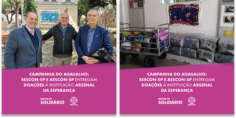 No dia 29/08, em mais uma iniciativa que reforça o compromisso do Programa Sescon-SP Solidário com a responsabilidade social, o diretor Edson Sales e o conselheiro fiscal Salvador Strazzeri visitaram o Arsenal da Esperança. Na ocasião, entregaram 123 roupas e 90 cobertores q foram comprados com as doações recebidas via PIX durante a Campanha do Agasalho deste ano. Ao todo foi arrecadado o valor de R$1.721,01 em PIX e utilizado R$1.290,00 para a compra dos cobertores, o restante do valor será utilizado para doações da próxima campanha